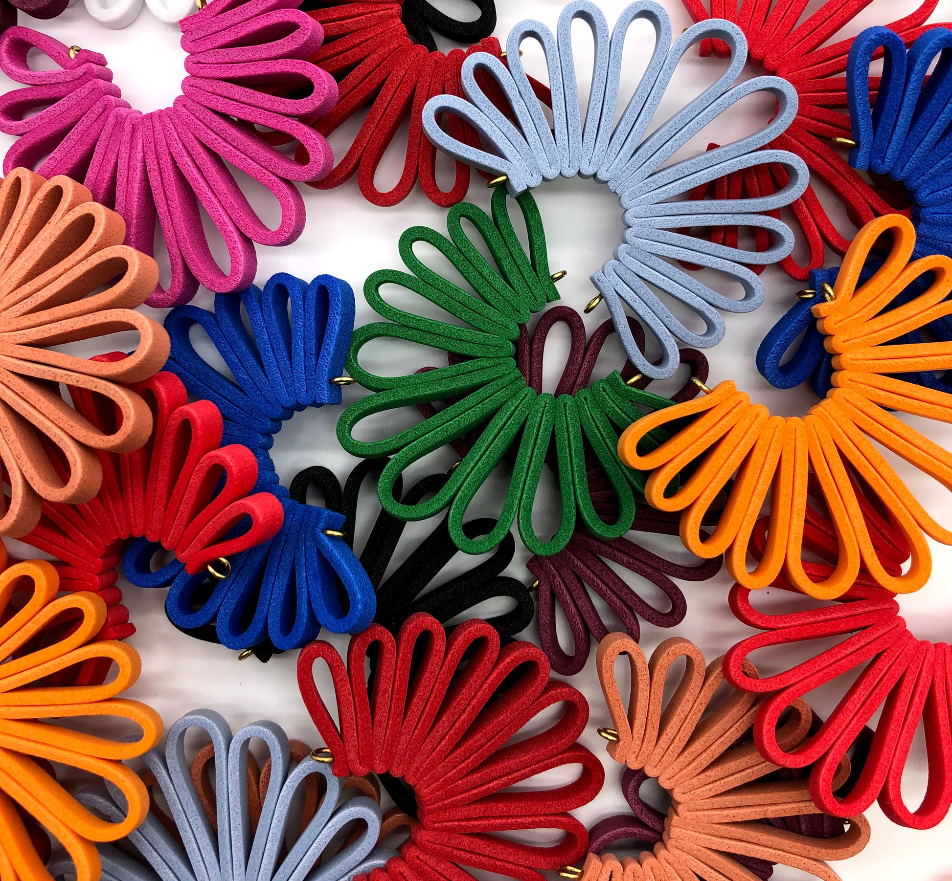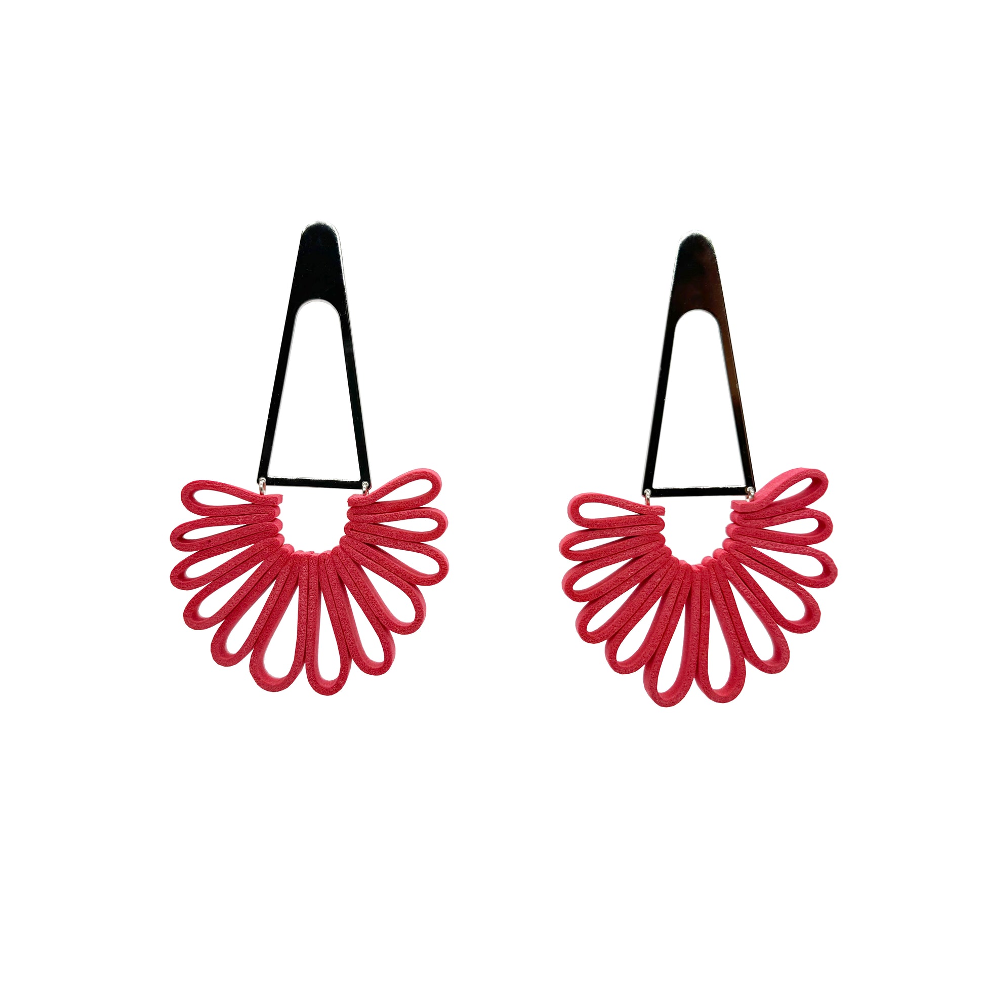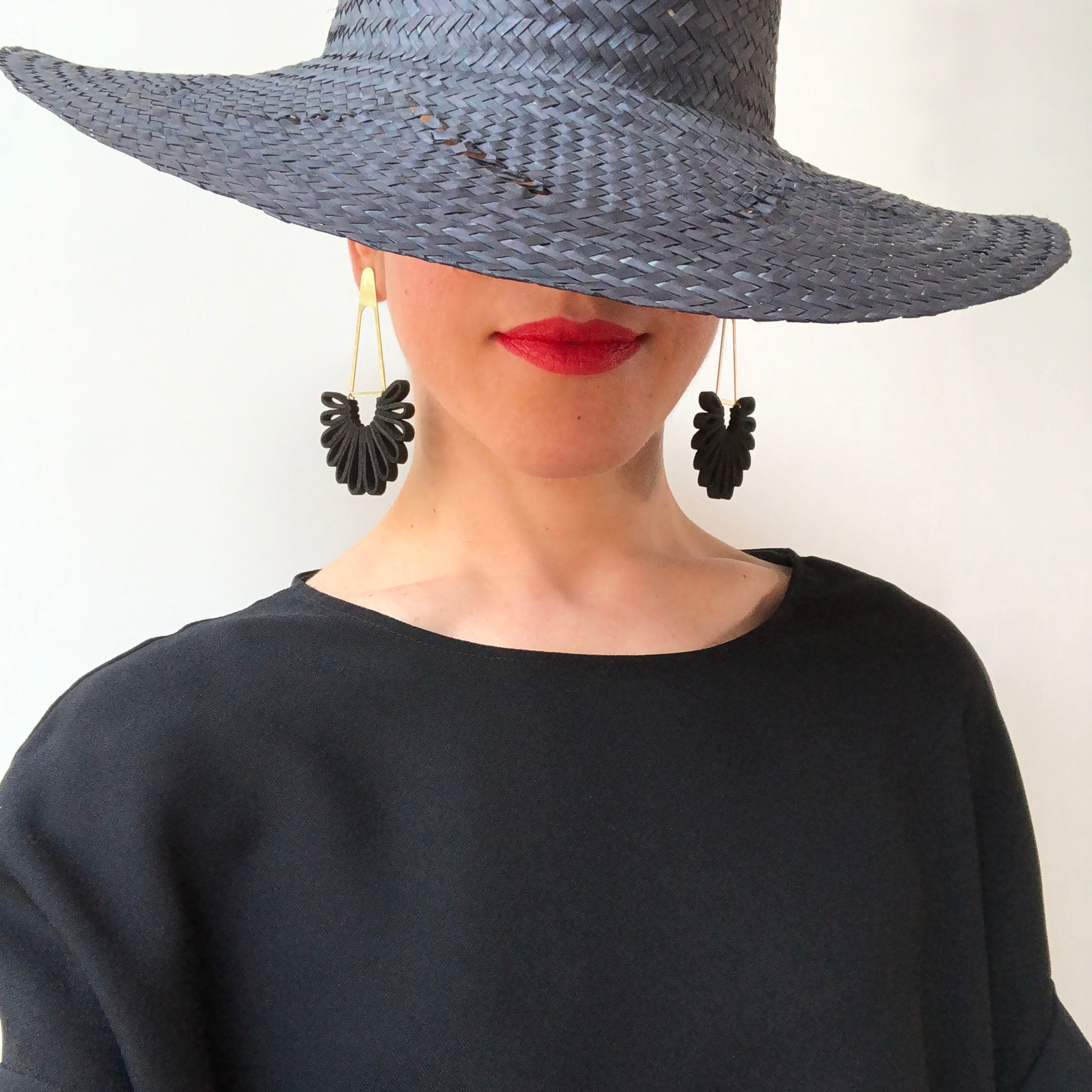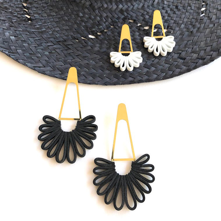 Gli orecchini sono composti di gomma crepla** spessa 1.5 mm e ottone brunito color argento. Sono lunghi circa 9 cm e larghi 5.5 cm e hanno il perno.