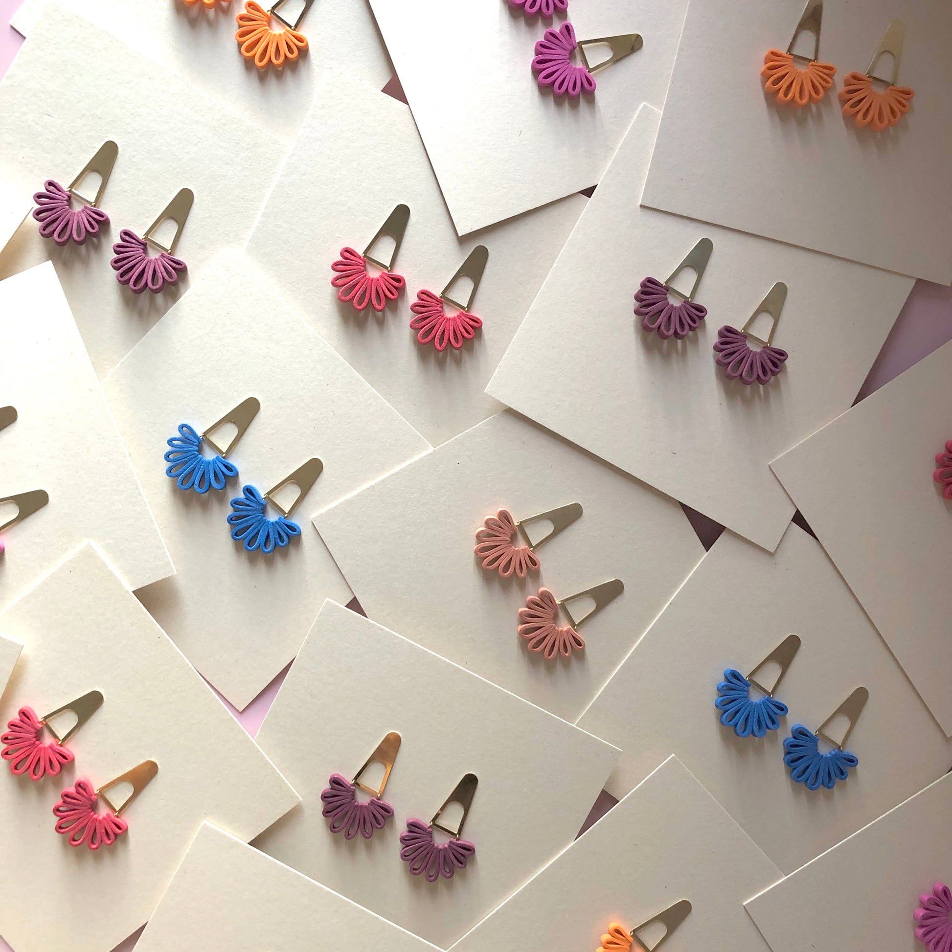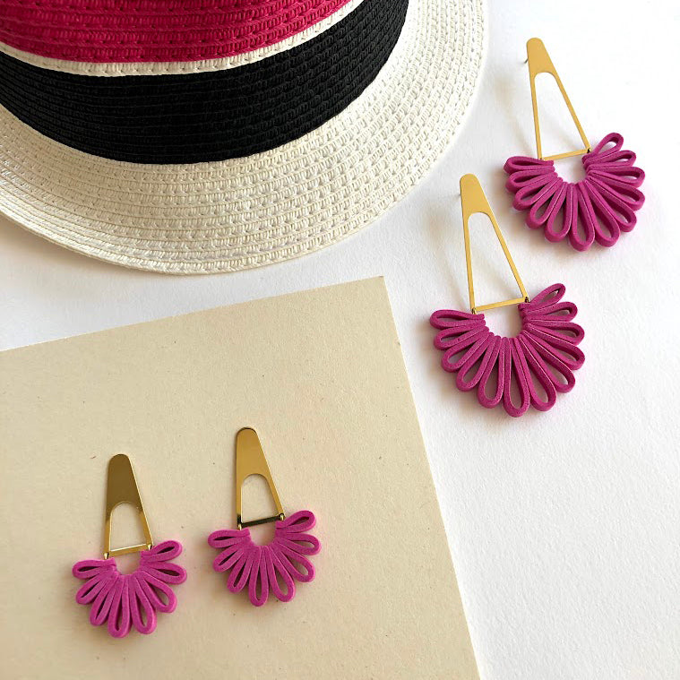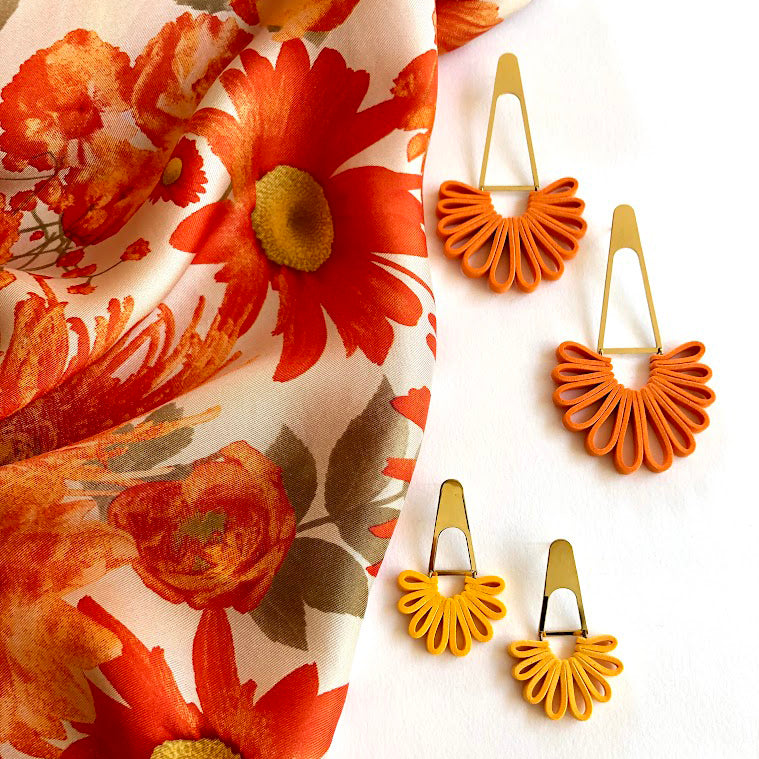 Gli orecchini sono composti di gomma crepla** spessa 1.5 mm e ottone dorato*. Sono lunghi circa 5.5 cm e larghi 3.5 cm e hanno il perno.