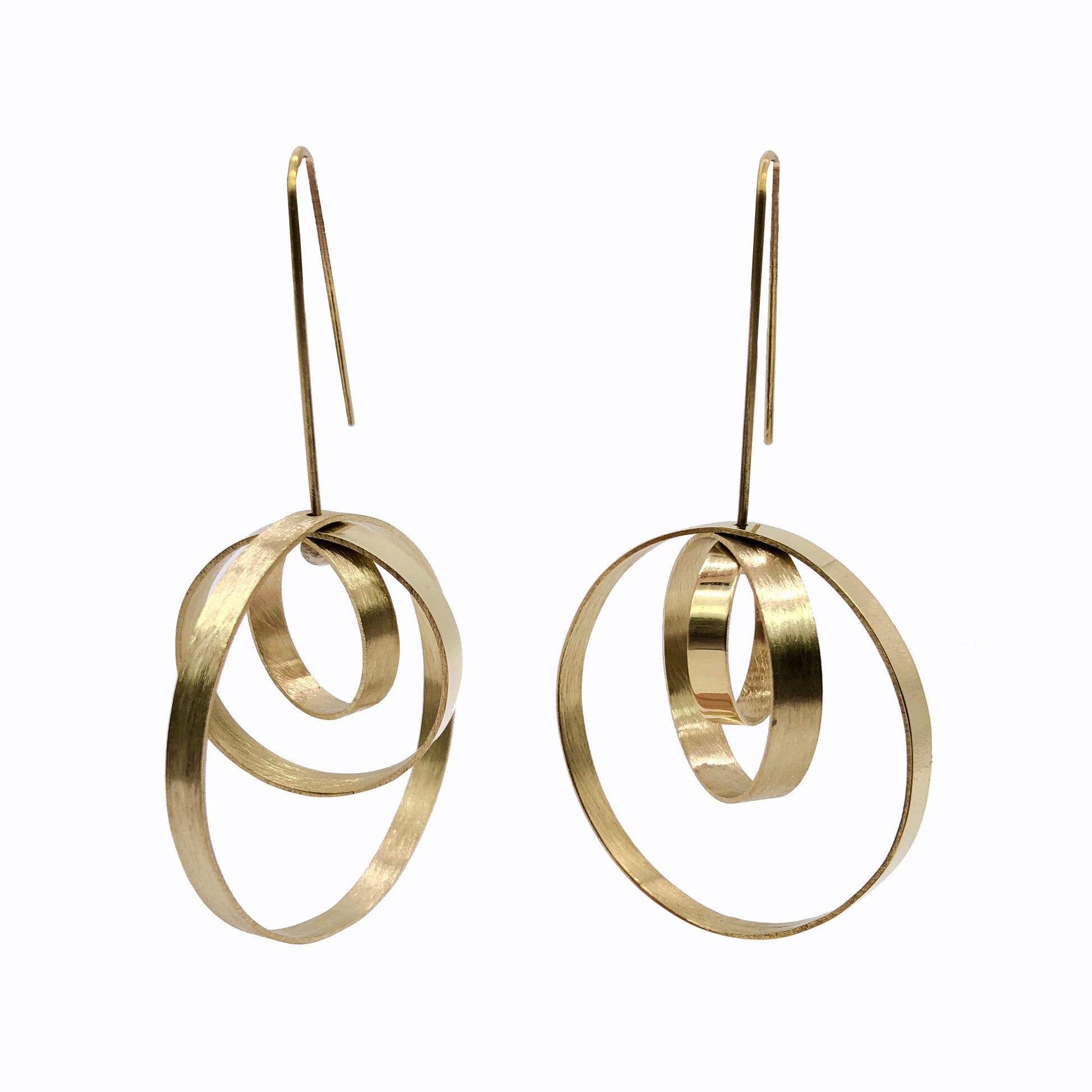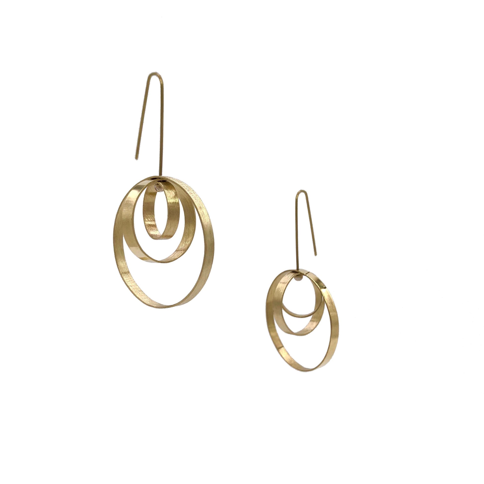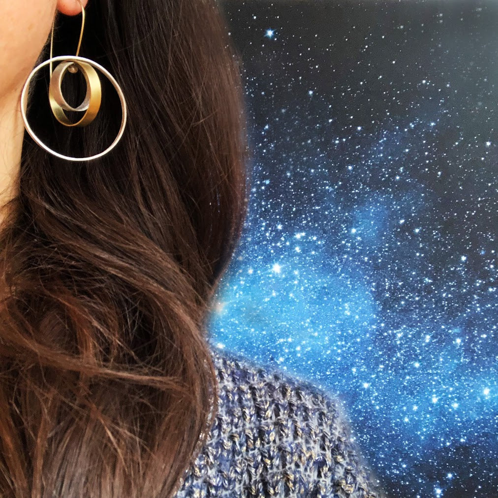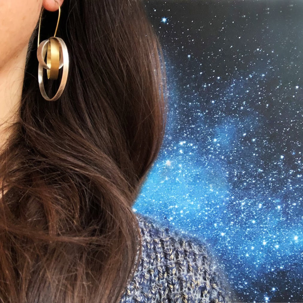 Scopri l'armonia degli orecchini componibili SATURNO in ottone dorato e brunito color argento*: tre cerchi con texture diverse ruotano attorno a un unico centro, creando giochi di design intorno al volto. Eleganza dinamica.