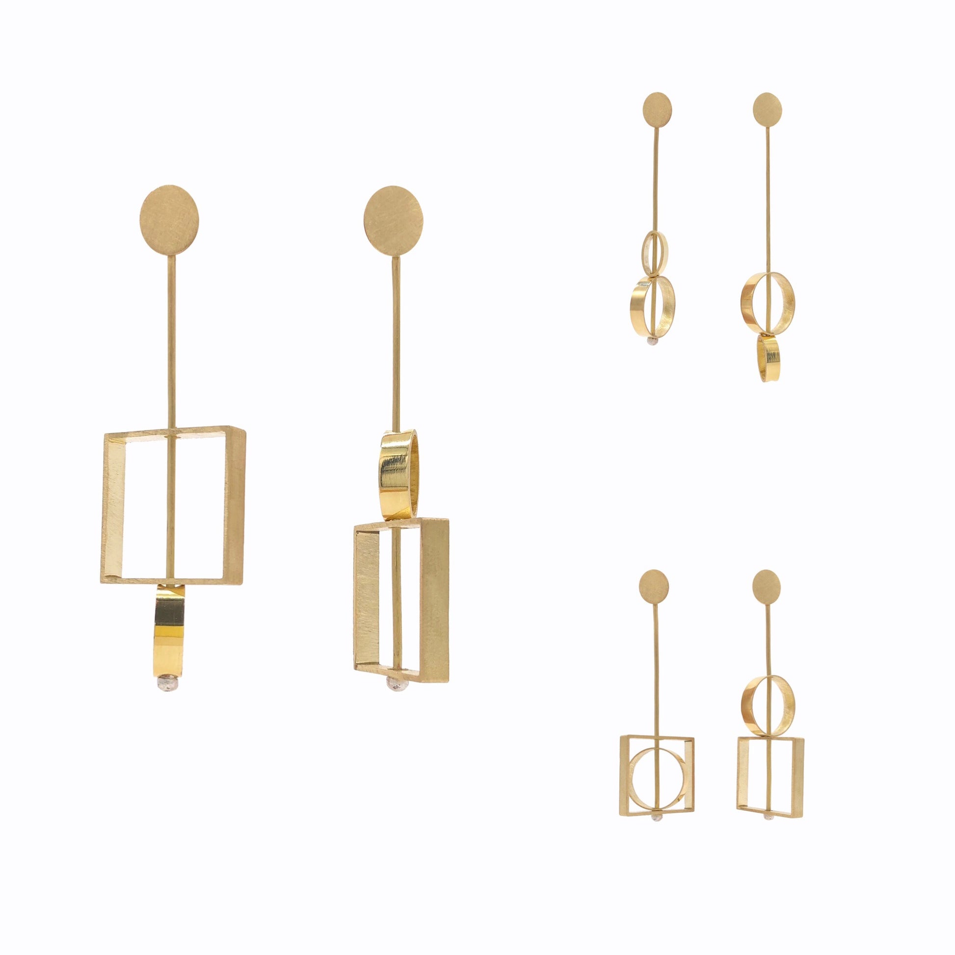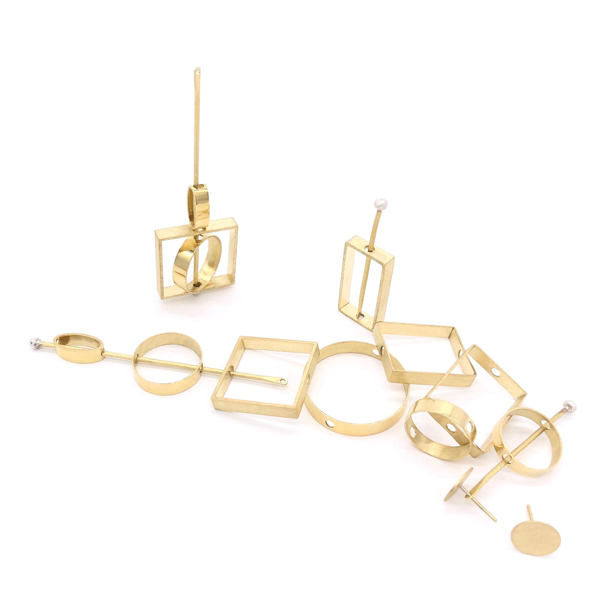 Sono costituiti da 12 pezzi di spessore di 0,6 mm: un paio di perni, due paia di barrette (un paio lunghe 7,5 cm e un paio lunghe 5,5), due quadrati, due cerchi e due ovali. Con questo set di Orecchini si creano tante diverse versioni: quella più lunga dai 7,5 ai 10 cm e quella più corta dai 5,5 agli 8 cm. Le forme presentano ognuna due fori nei quali si può far passare la barretta scelta. In alto la barretta presenta un foro dove poter inserire in perno in modo da poter indossare al lobo l'orecchino creato.