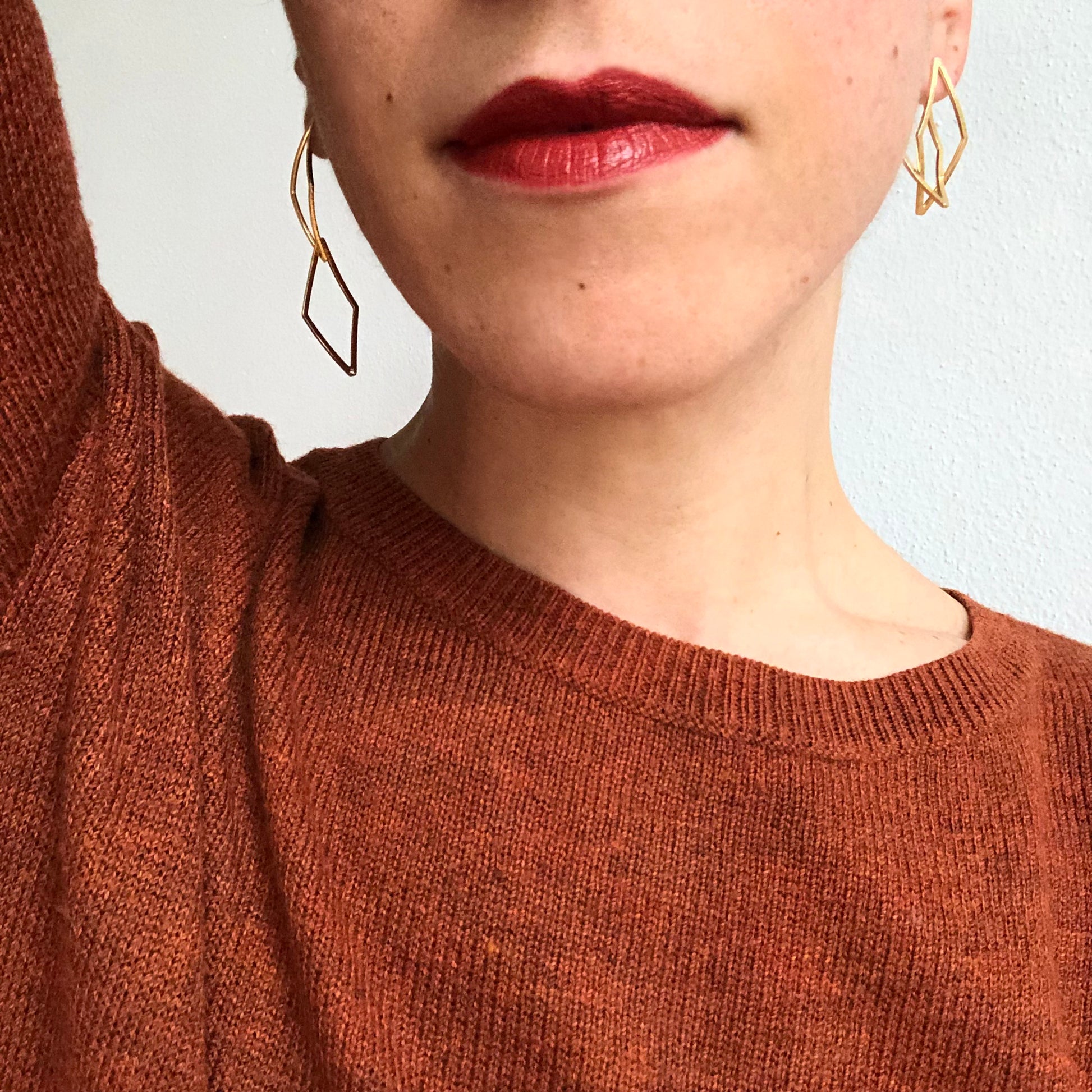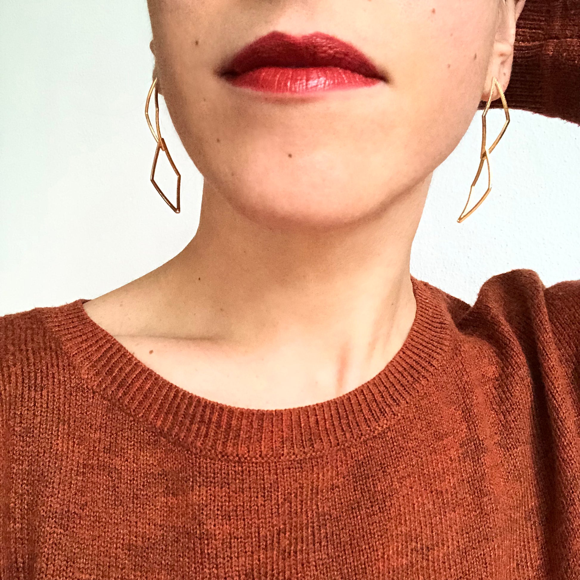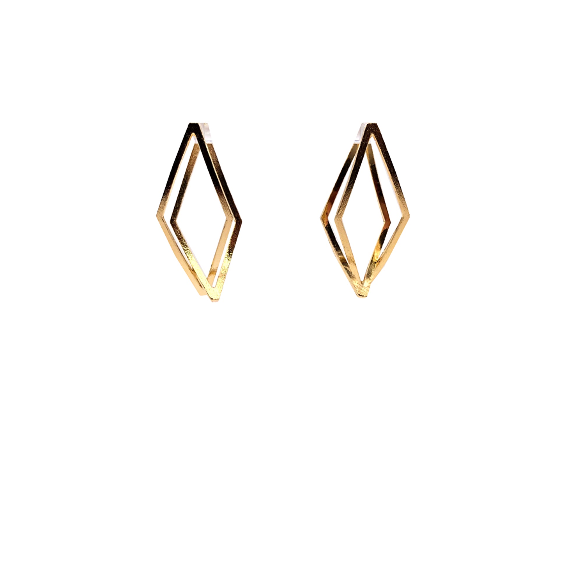 Sono costituiti da 2 rombi intersecati. Hanno una texture graffiata e hanno il perno. Una volta indossati si inserisce il perno nel foro del rombo appeso per creare la versione corta. Con questo set di Orecchini si creano tre diverse versioni. Da una più corta (3 cm) ad una più lunga (6 cm).