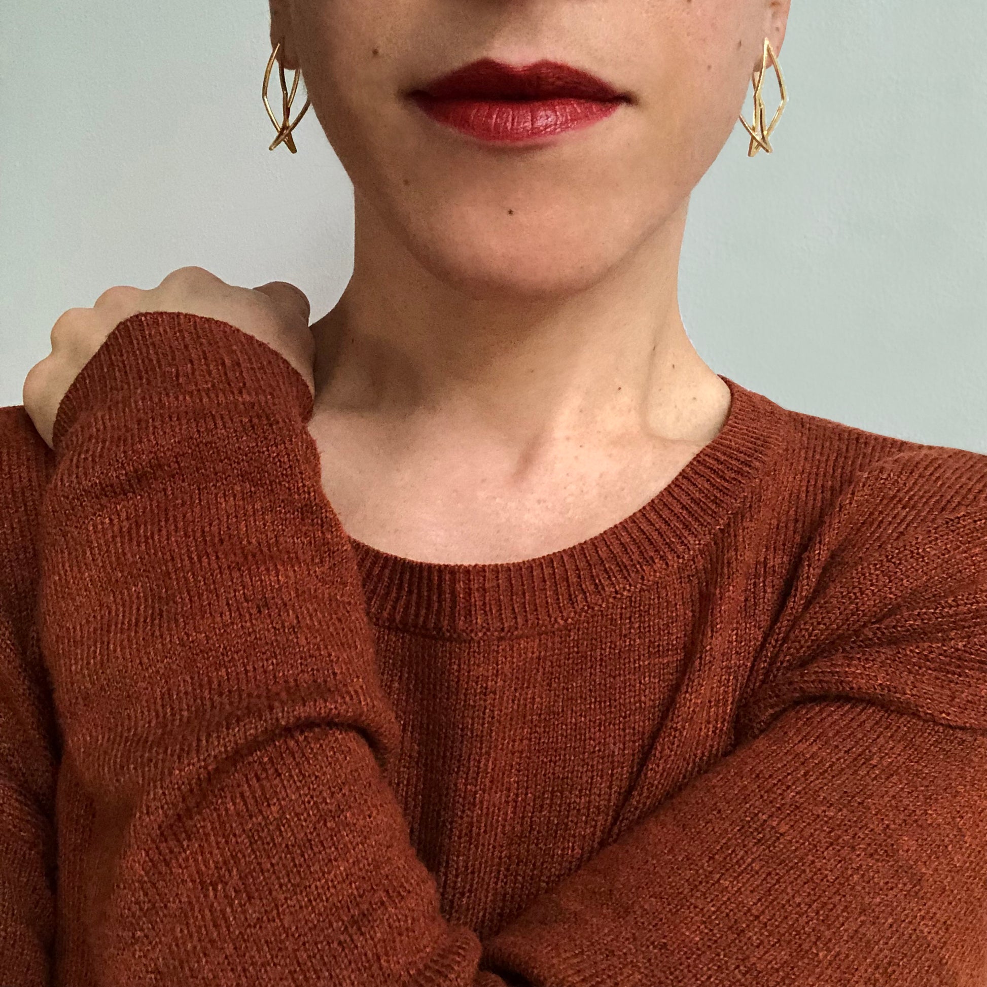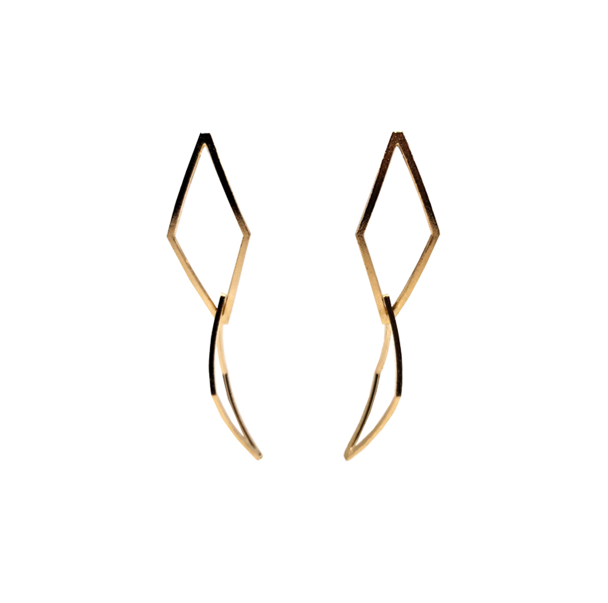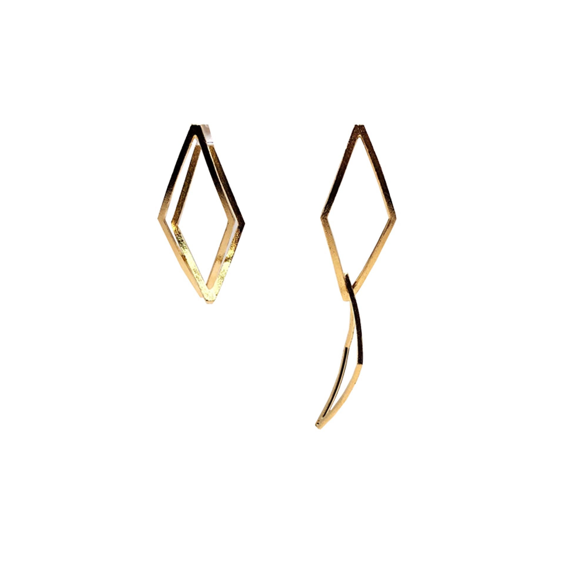 Sono costituiti da 2 rombi intersecati. Hanno una texture graffiata e hanno il perno. Una volta indossati si inserisce il perno nel foro del rombo appeso per creare la versione corta. Con questo set di Orecchini si creano tre diverse versioni. Da una più corta (3 cm) ad una più lunga (6 cm).
